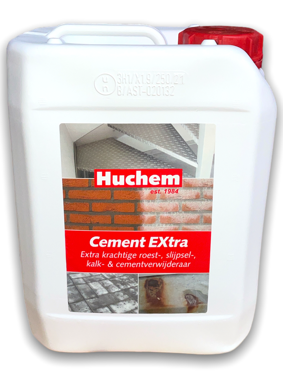 Huchem Cement EXtra is een extra krachtig reinigingsproduct voor het verwijderen van zware en/of hardnekkige vervuiling veroorzaakt door o.a. cementsluier, slijpsel, roestaanslag, kalkaanslag, resten van cementklinker en slakken. Bij matige tot gemiddelde vervuiling adviseren wij Huchem Roka, onze krachtige roest-, slijpsel-, kalk- & cementverwijderaar.