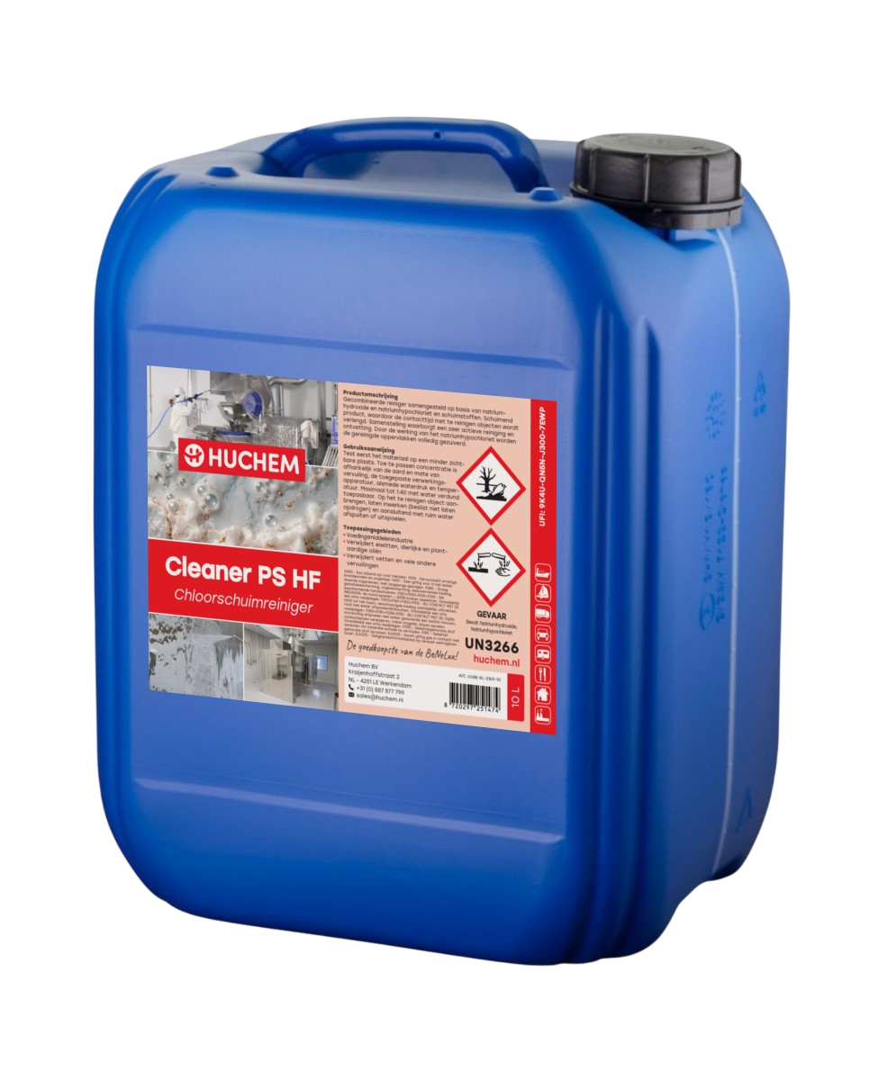 Huchem Cleaner PS-HF is een krachtige chloorschuimreiniger, speciaal ontwikkeld voor de voedselverwerkende industrie en horeca. Deze hoog schuimende, chloor- en alkalibasisreiniger verwijdert effectief hardnekkig vet, eiwitten en andere organische vervuiling van vloeren, muren en apparatuur.