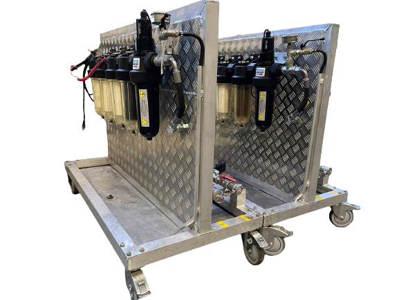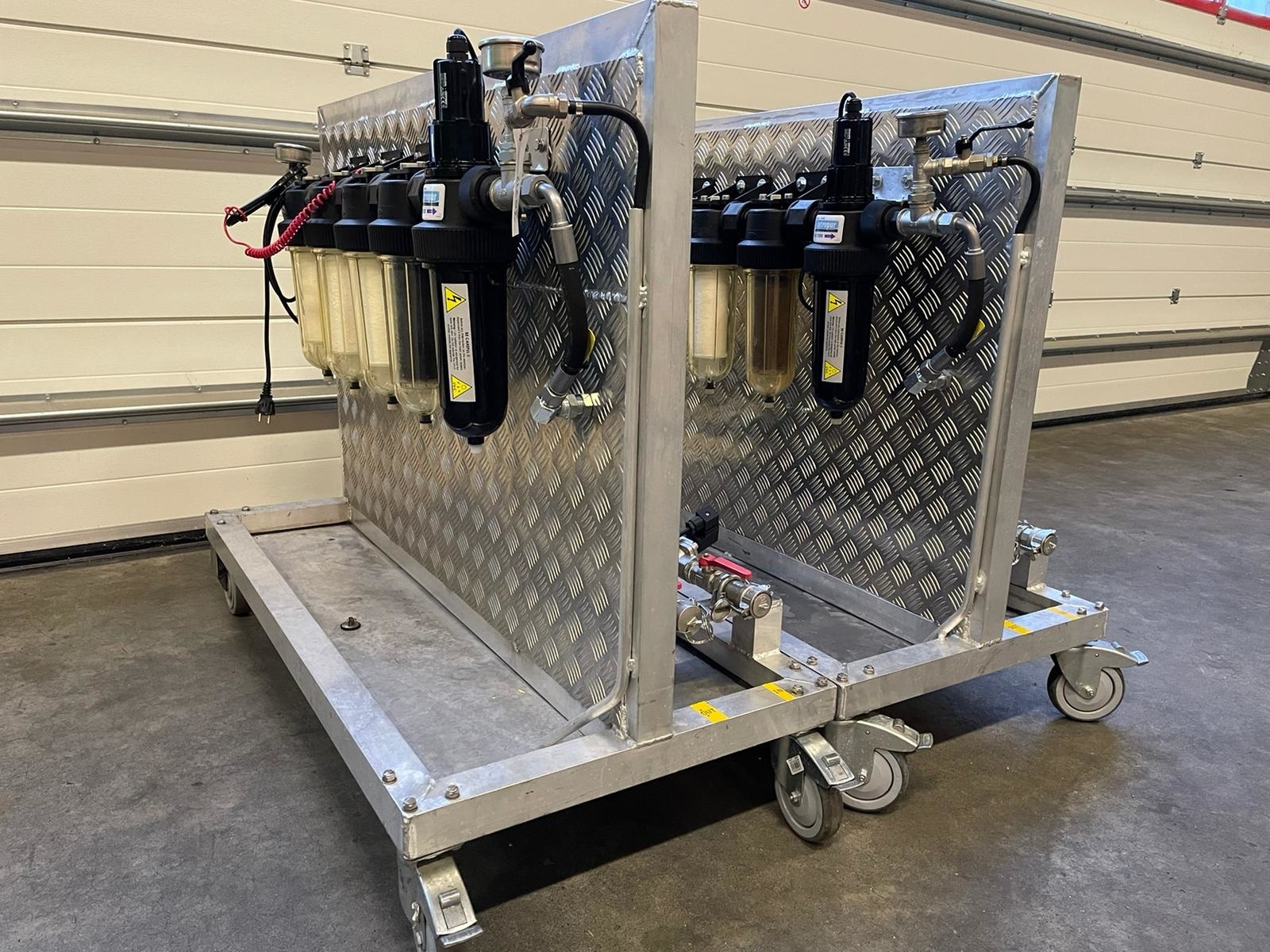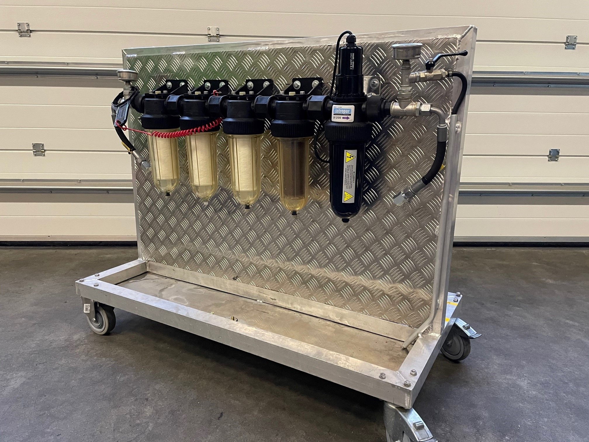 Het systeem heeft een filtervermogen tot 100 Mu (μ). Dit betekent dus dat vrijwel alle deeltjes en bacteriën door het filter systeem opgevangen en gefilterd worden. Dit systeem koppelt u, middels een bypass, aan uw systeem. Vervolgens laat u deze meedraaien in het proces, binnen een bepaalde tijd bevat uw systeem geen bacteriën of andere deeltjes meer. Voor wat betreft de tijdsperiode dat deze unit ingezet moet worden hangt af van de grote van de installatie, de pompcapaciteit van deze unit is ongeveer 1000 ltr/uur. Wel is noodzakelijk dat er tijdig filters gewisseld worden.