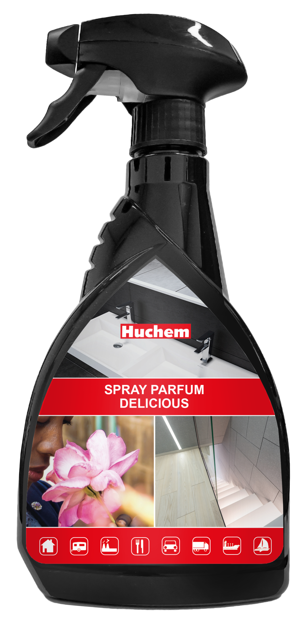 Bestrijd nare geurtjes met de Spray Parfum Delicious van Huchem. Geschikt voor trappenhuizen, kelders, vuilcontainers, sanitair ruimtes of na brandschade. De luchtverfrisser werkt zeer zuinig: 1 á 2 keer sprayen is voldoende voor een langdurig frisse geur