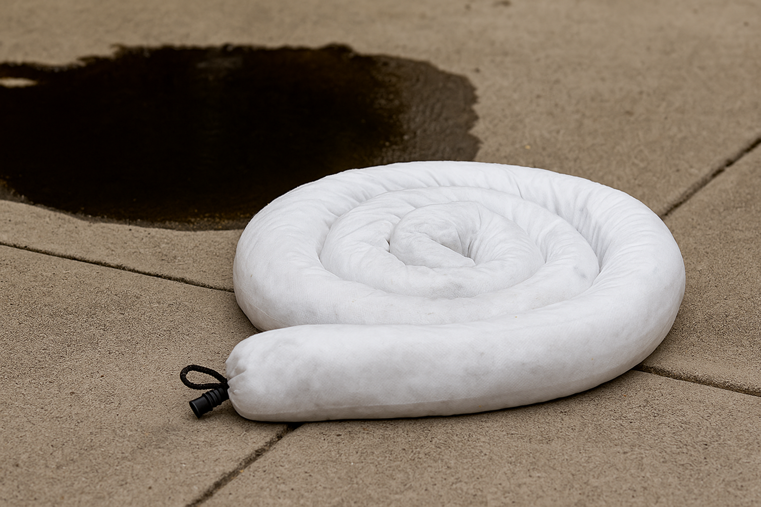 Professionele Hugo SpillShield Only Oil Oliesokken (ca. 8 x 120 cm) voor het snel en milieuvriendelijk absorberen van olie- en brandstoflekkages. Waterafstotend, chemisch resistent. Binnen én buiten inzetbaar – absorbeert tot 40 liter.