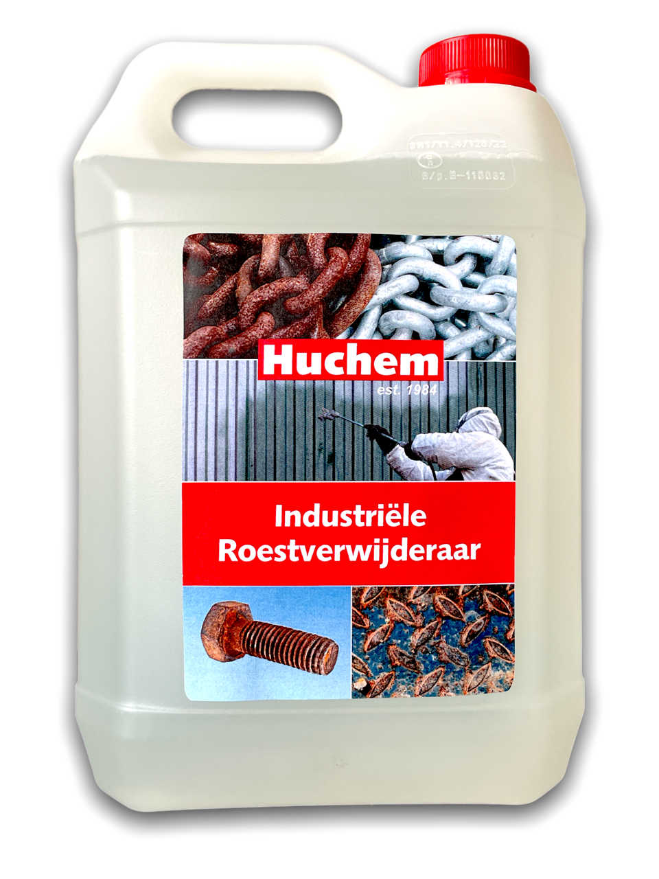 Industriële roestverwijderaar (5 L) van Huchem op basis van organische zuren en tensiden. Verwijdert roest van metalen oppervlakken, vormt zink-achtige beschermlaag en is overschilderbaar. Geen zoutzuur, biologisch afbreekbaar.