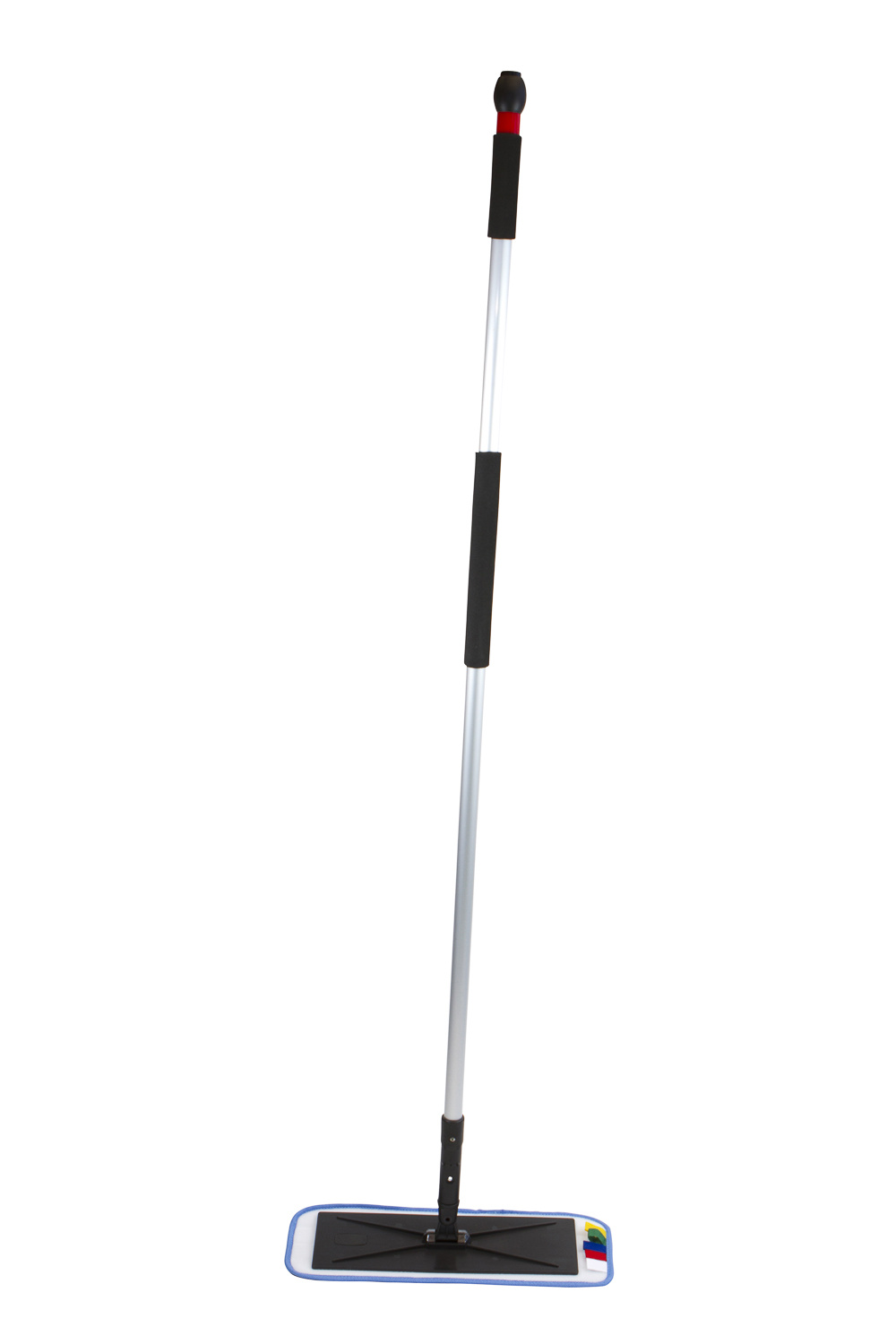 Mop frame met spraysteel. De dop is afschroefbaar, de steel dient als reservoir voor 400 ml vloeistof. Gekleurde steelringen voor toepassingscodering. Mop bevestiging door middel van velcro systeem.