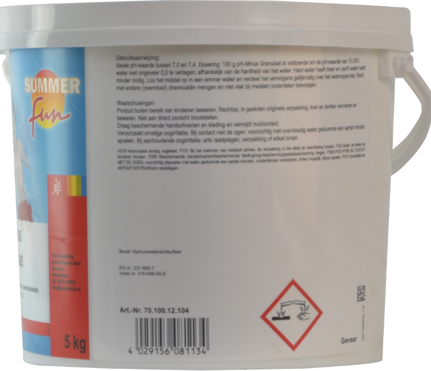 Summer fun PH- (min) 5 kg is een middel om de pH-waarde van het zwembadwater te verlagen. De pH-waarde is belangrijk voor een optimale werking van de chloorproducten en dient tussen 7,2 en 7,6 te worden gehandhaafd.