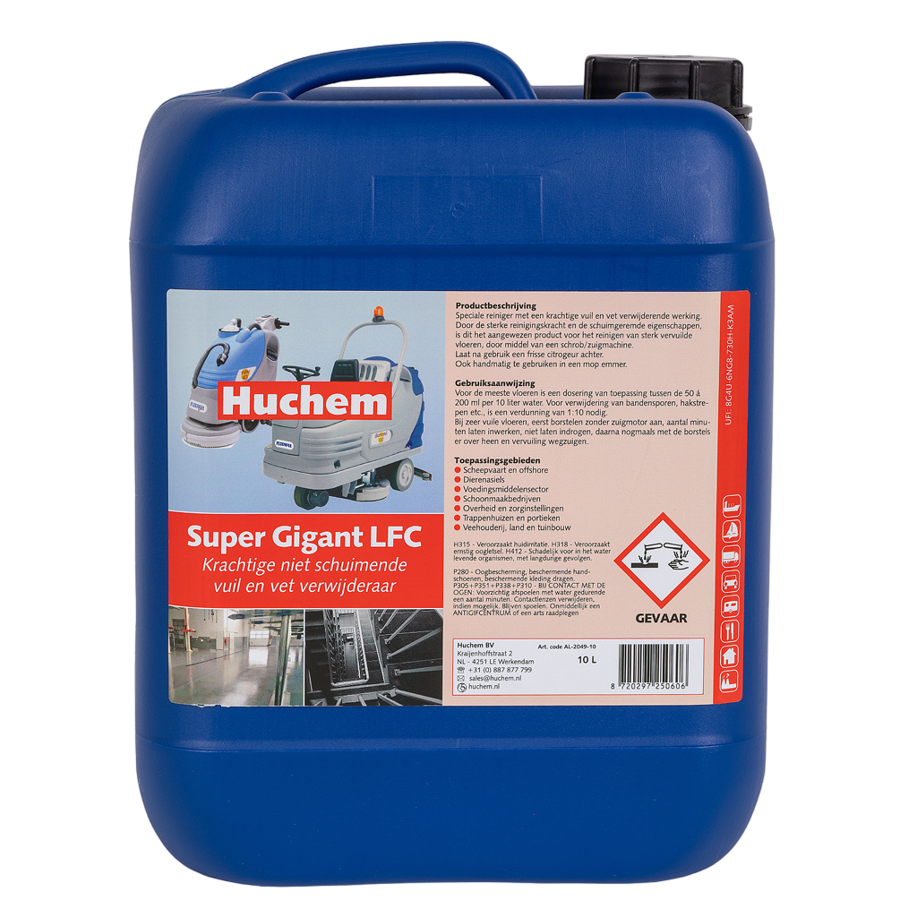 Huchem Super Gigant LFC 10 L: krachtige, laagschuimende vloer- en machine-reiniger voor sterke vervuiling. Ideaal voor schrob-/zuigmachines, waterbestendige vloeren & industriële gebruik.
