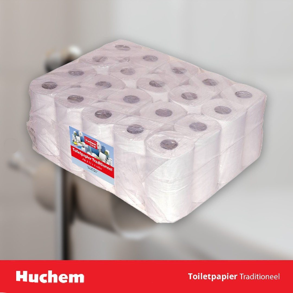 Dit Huchem Traditioneel Toiletpapier is wit van kleur en geschikt voor de traditionele wc-rol houders, zoals men deze in vrijwel alle huishoudens en bij veel bedrijven tegenkomt. De houder is vaak niet meer dan een staaf of stang waarover men de wc-rol schuift, en de wc-rol is dan ook uitgerust met een kartonnen koker in het midden.