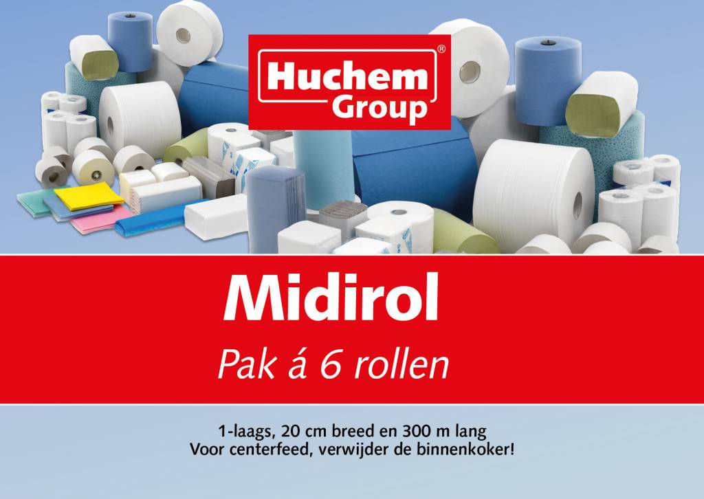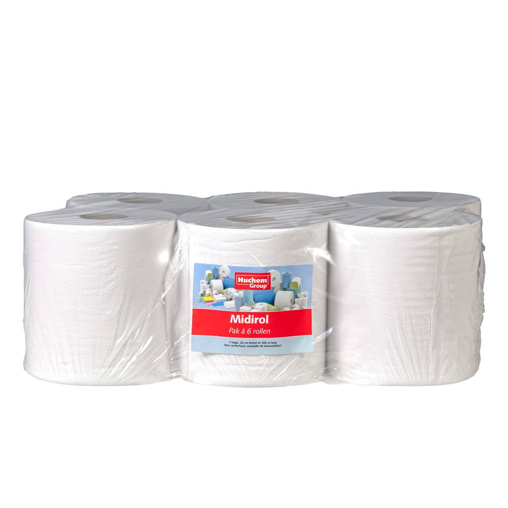 Papieren handdoekrol in een verpakking van 6 midi rollen. Elke midi rol is ca. 300 meter lang en ca. 19 cm breed. U ontvangt dus maar liefst 1800 meter aan papieren handdoeken door middel van 1 bestelling.